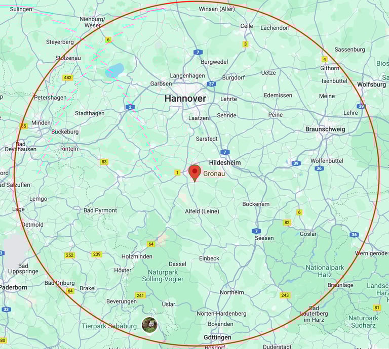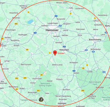 Regulär bin ich in dem auf der Karte markierten Umkreis (Raum Hannover, Braunschweig, Göttingen) unterwegs.